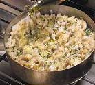 Blumenkohl wird normalerweise kurz vorgekocht um den Geruch zu vermeiden, den viele als streng bezeichnen. Er wird zusammen mit Tomatenpüree und viel Knoblauch und Öl gedünstet.