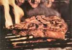 DieLeberstückchen, Lorbeerblätter und Brotwürfelwerden abwechselnd auf einen Metallstab gespießt und auf einem Rost über offenem Feuer solange gebraten, bis die Leber schön zart geworden ist.