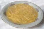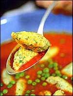 Rindfleischbrühe mit gemahlenen Mandeln, Eiern, geriebenem Parmesan und Brot-Croutons. Alles zusammen gekocht wird sie ganz heiß mit einer Garnitur an frischer, fein gehackter Petersilie serviert.
