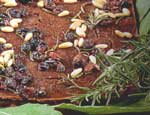 Mit Zucker bestreute Weintrauben, zwischen zwei Teigschichten und mit warmem Öl mit Rosmarinblättern beträufelt.