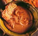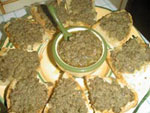 Bauernbrotschreiben werden mit heißer Zwiebelsuppe völlig bedeckt und mit geriebenen oder in Scheiben geschnittenen Gruyére oder Fontina- Käse bestreut. Das Ganze wird so lange im Ofen gebacken bis der Käse geschmolzen, leicht braun und knusprig ist.
